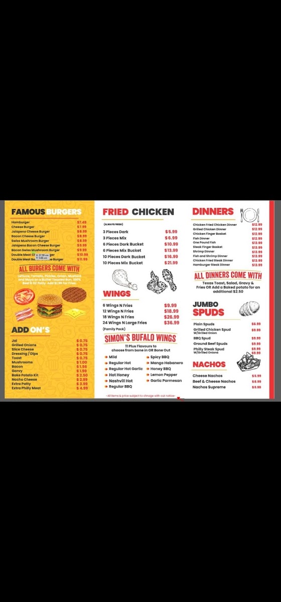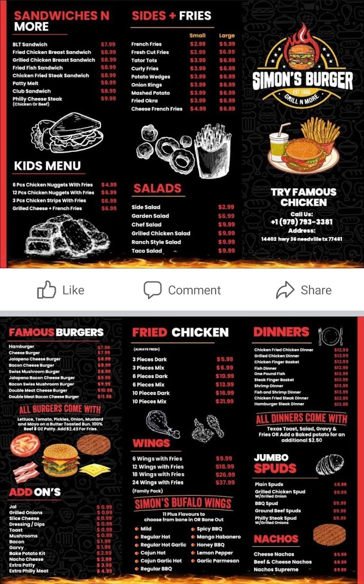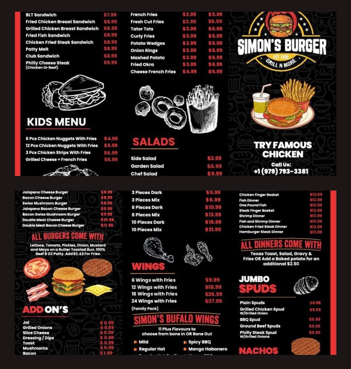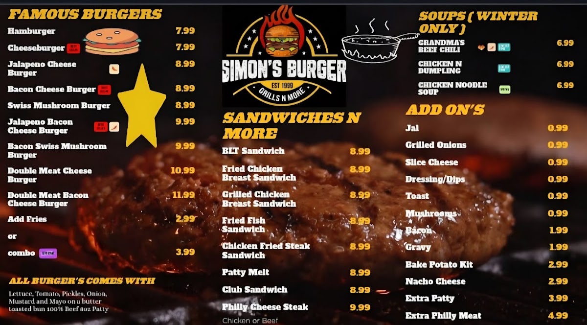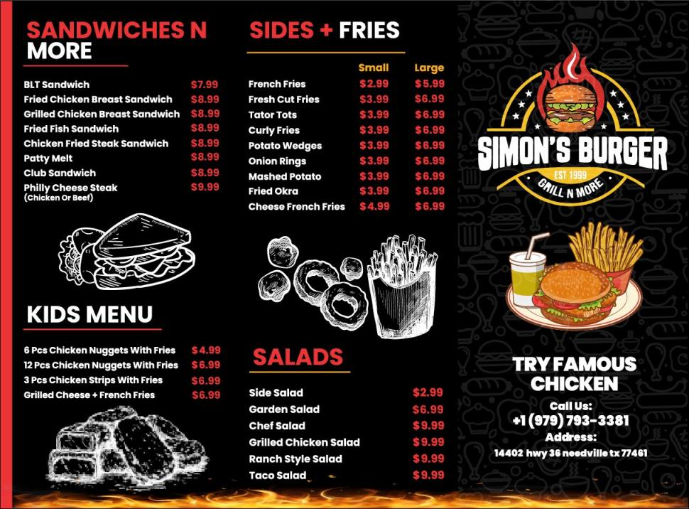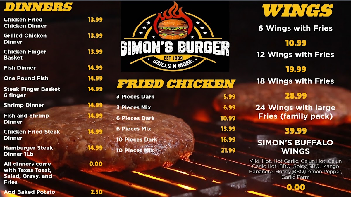 Simon's Burger Grill & More Menu offers a mouthwatering selection of classic and creative burgers that will satisfy any craving. Located in Needville, Texas, this spot is the perfect place to indulge in juicy, handcrafted burgers made with fresh ingredients. Whether you're in the mood for a classic cheeseburger or something with a little more flair, like the BBQ Bacon Burger, the menu has something for everyone.